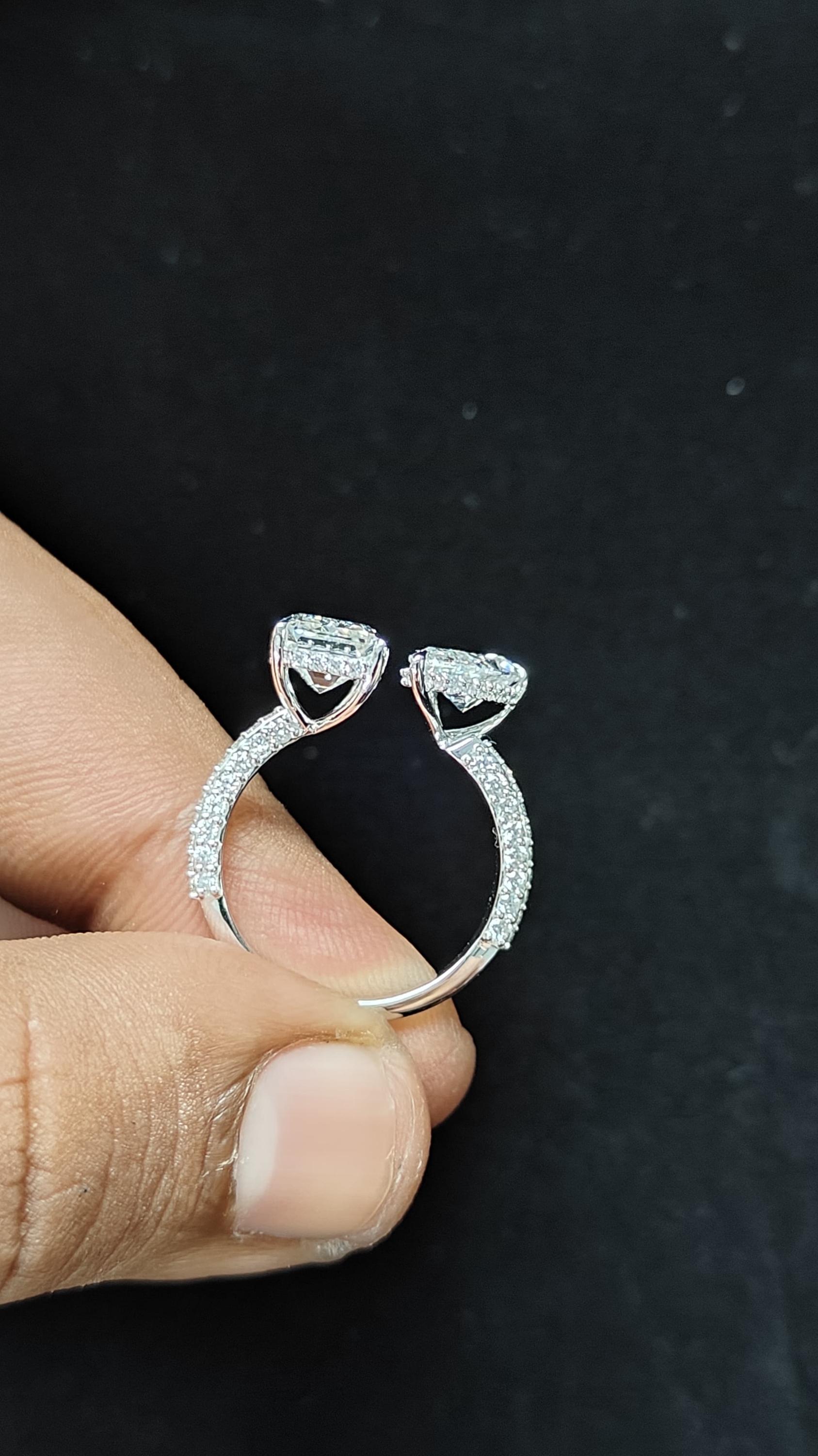 Celebrate love, individuality, and timeless elegance with this stunning Toi et Moi bypass ring. Featuring two brilliant stones set in a graceful open design, this piece symbolizes the union of two souls. The pavé diamond band sparkles with every movement, while the sleek white gold setting enhances the brilliance of the stones.